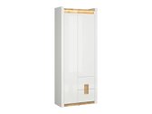 Esta colección de muebles es única porque ofrece una amplia selección de modelos de muebles para varios espacios del hogar. Cree un estilo interior cohesivo tanto en la sala de estar como en el dormitorio. ¿Y si los muebles también combinen en el pasillo? ¿O en la oficina? Todo esto es posible con esta colección. La paleta de colores claros quedará genial tanto en espacios pequeños como grandes. Las fachadas de los muebles están dominadas por el color blanco brillante, que se complementa perfectamente con detalles en color madera. El color y los patrones de la madera se revelan bellamente en las mesas de los muebles, dando una sensación de comodidad. También llama la atención la solución del tirador, que encaja no solo como tirador, sino también como detalle decorativo. Sin duda, habrá suficiente espacio para guardar cosas, los muebles tienen muchos cajones y estantes. La iluminación LED integrada de bajo consumo proporciona un encanto adicional. Esta solución le permitirá disfrutar de una luz acogedora que resaltará las inserciones de color madera. El mecanismo de cierre silencioso protegerá las puertas y los cajones del cierre rápido.