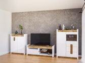Esta colección de muebles es única porque ofrece una amplia selección de modelos de muebles para varios espacios del hogar. Cree un estilo interior cohesivo tanto en la sala de estar como en el dormitorio. ¿Y si los muebles también combinen en el pasillo? ¿O en la oficina? Todo esto es posible con esta colección. La paleta de colores claros quedará genial tanto en espacios pequeños como grandes. Las fachadas de los muebles están dominadas por el color blanco brillante, que se complementa perfectamente con detalles en color madera. El color y los patrones de la madera se revelan bellamente en las mesas de los muebles, dando una sensación de comodidad. También llama la atención la solución del tirador, que encaja no solo como tirador, sino también como detalle decorativo. Sin duda, habrá suficiente espacio para guardar cosas, los muebles tienen muchos cajones y estantes. La iluminación LED integrada de bajo consumo proporciona un encanto adicional. Esta solución le permitirá disfrutar de una luz acogedora que resaltará las inserciones de color madera. El mecanismo de cierre silencioso protegerá las puertas y los cajones del cierre rápido.