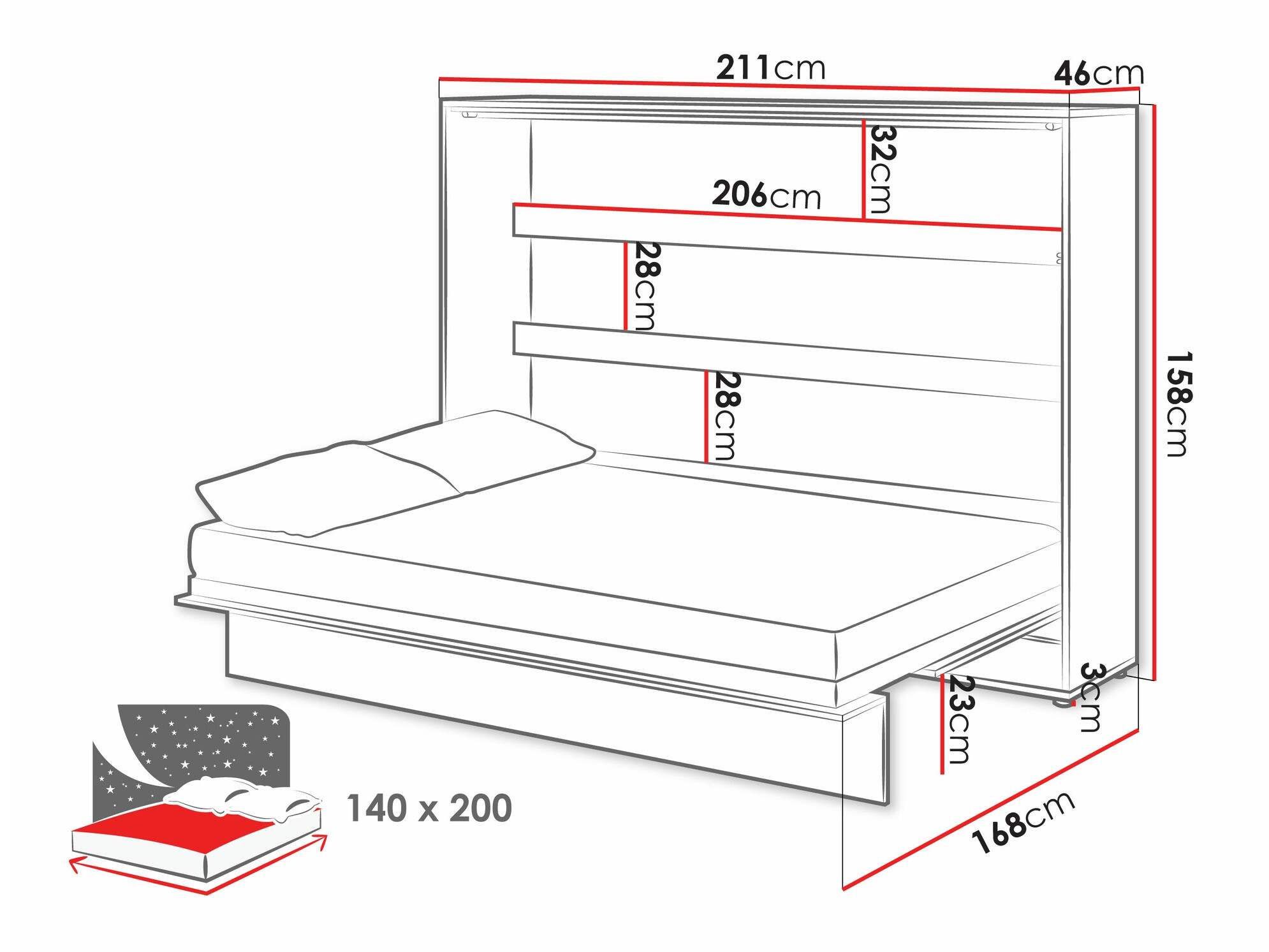Sujetar la cama es un paso importante para garantizar un uso seguro. No monte la cama a una pared de yeso. Otro elemento importante es su conjunto de herrajes, que se pueden utilizar para fijar la cama a la pared. La cama abatible está equipada con un dispositivo de seguridad que protege la cama para que no se abra accidentalmente. Un mecanismo neumático permite abrir y cerrar la cama de forma muy silenciosa. Podrás conseguir un espacio para dormir sin esfuerzo: esta es una de las muchas razones por las que se escoge habitualmente este mueble para las habitaciones juveniles y para los pequeños apartamentos tipo estudio, ya que se ahorra espacio.