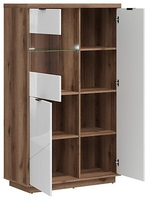La colección con su diseño moderno, complementado con formas de inspiración minimalista. Este es un ejemplo de un estilo interior moderno. Los motivos decorativos en las fachadas dan a los muebles un encanto extra. Los muebles de esta colección encajarán perfectamente en el espacio vital. Definitivamente habrá suficiente espacio para las cosas, porque los muebles no carecen de estantes y cajones espaciosos. Al crear un diseño, también se recuerda la funcionalidad. Los cajones y las puertas tienen un mecanismo de cierre silencioso que protege la puerta y los cajones del cierre rápido, sin generar ruido adicional. Las vitrinas utilizan vidrio templado, que se caracteriza por su resistencia y durabilidad. Adicionalmente, se integrará iluminación LED en las vitrinas, que resaltará los detalles del interior de las vitrinas. Elija su color favorito y comience a hacer cambios en el interior de su hogar.