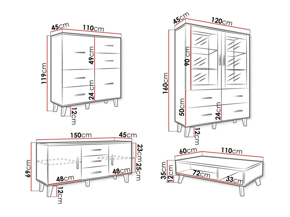 Los colores de las fachadas dan armonía y comodidad al interior de la sala de estar. Los muebles de la colección están disponibles en varias opciones de color: roble "Wotan" con blanco o blanco con detalles en roble claro. La colección incluye todo el mobiliario imprescindible para el salón: mesas de centro y de TV, cómoda, vitrina y armario.