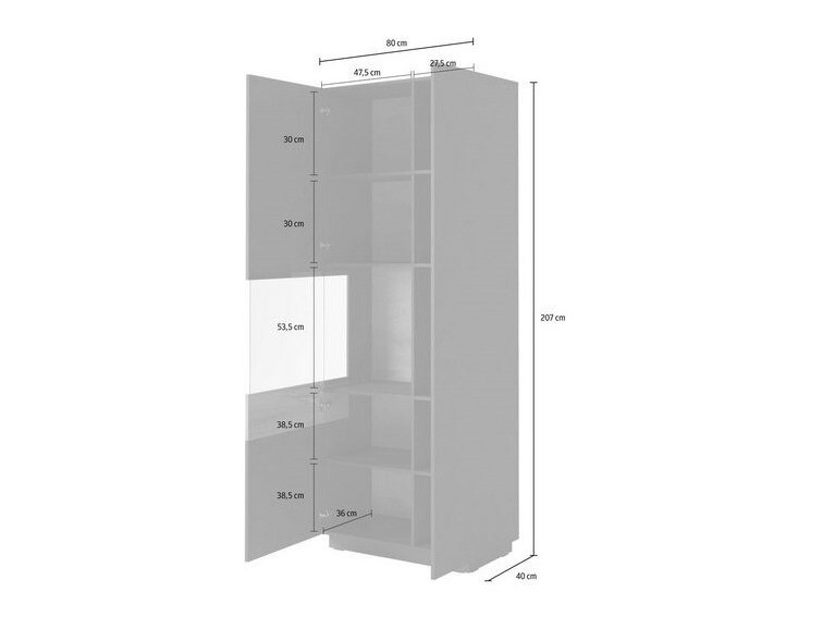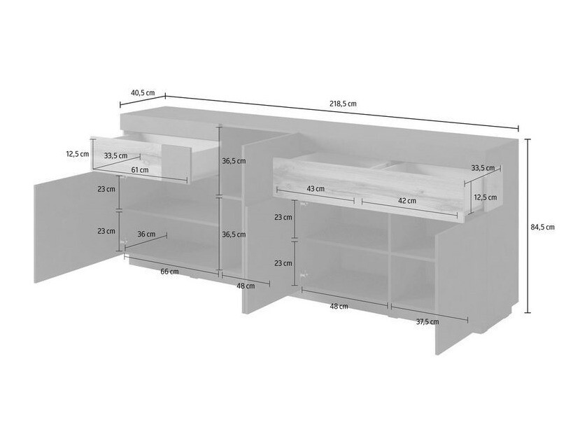 La colección combina colores gris oscuro o blanco con una decoración en color roble. También puedes elegir una combinación de colores blanco y hormigón claro. Las superficies blancas ybrillantes aportarán una sensación de frescura a tu hogar, mientras que elgris mate enfatizará la singularidad del interior.
