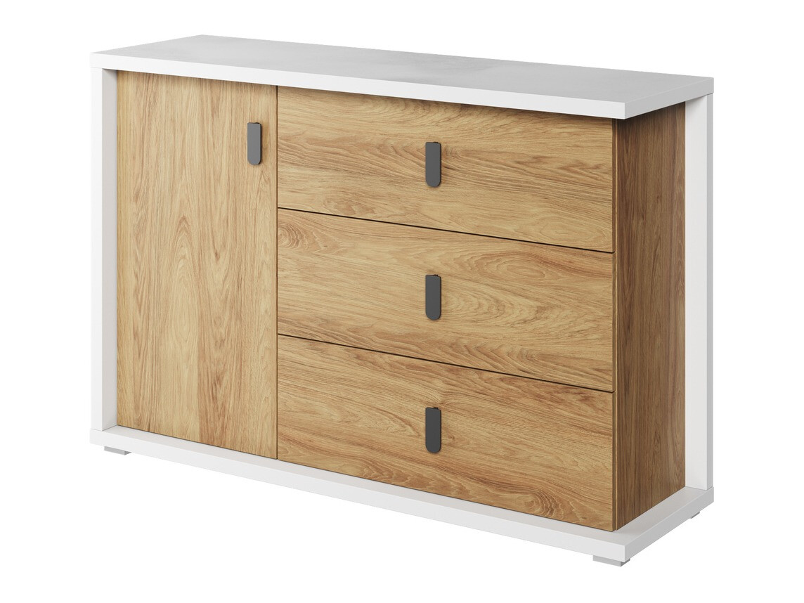 Los muebles de la colección impresionan con su paleta de colores brillantes y su diseño simple. El color blanco y el roble cálido se combinan aquí. Esta combinación de colores y la simplicidad de las líneas recuerda el estilo interior escandinavo, complementado con detalles interiores modernos. El marco de muebles blanco masivo le da a los muebles su singularidad. Las fachadas utilizan pequeños tiradores de plástico que combinan a la perfección con todo el diseño. El espacio en los muebles se aprovecha por completo: una mesa con una mesa grande, cajones espaciosos, estantes con muchos compartimentos, esto facilitará el mantenimiento del orden. Cree la habitación de ensueño de un joven a partir de muebles individuales o eligiendo un conjunto de muebles donde los muebles ya estén combinados.