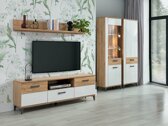 Probablemente estará de acuerdo en que pasar tiempo en un salón acogedor es un verdadero placer: es suficiente tener los muebles adecuados que ayuden a crear el ambiente deseado. Esta colección de muebles de salón es perfecta para aquellos que buscan soluciones modernas y acogedoras para el espacio de su hogar. El mobiliario combina el blanco brillante y el roble dorado. Esta combinación de colores le da la calidez y comodidad. Además, la impresión de naturalidad se da a los muebles por los patrones de madera, cuyos se pueden ver en la superficie de los muebles. Un acento importante son las manijas de los muebles, que crean un motivo único de los muebles con su diseño. La forma de los tiradores y la colocación de las incrustaciones de roble dorado crean una combinación divertida. Tampoco se olvida la funcionalidad: cómodas, estantes y vitrinas le permitirán acomodar convenientemente todos los artículos más importantes. Las vitrinas están hechas de vidrio templado, que tiene una mayor resistencia mecánica que el vidrio ordinario. Los cajones y las puertas tienen un mecanismo de cierre silencioso. Este mecanismo es especial porque protege puertas y cajones para que no se cierren rápidamente. Usted creará un ambiente aún más acogedor en su hogar al pedir adicionalmente iluminación LED.