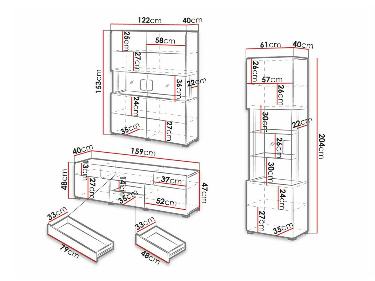 La colección incluye armarios de varios tamaños, amplias cómodas, un estante y una mesa de café. El acabado brillante de los muebles dará a la habitación mayor sensación de amplitud. Las puertas y los cajones de la cómoda se pueden abrir con un solo clic, gracias al mecanismo integrado "Push to open" que facilita enormemente su uso.